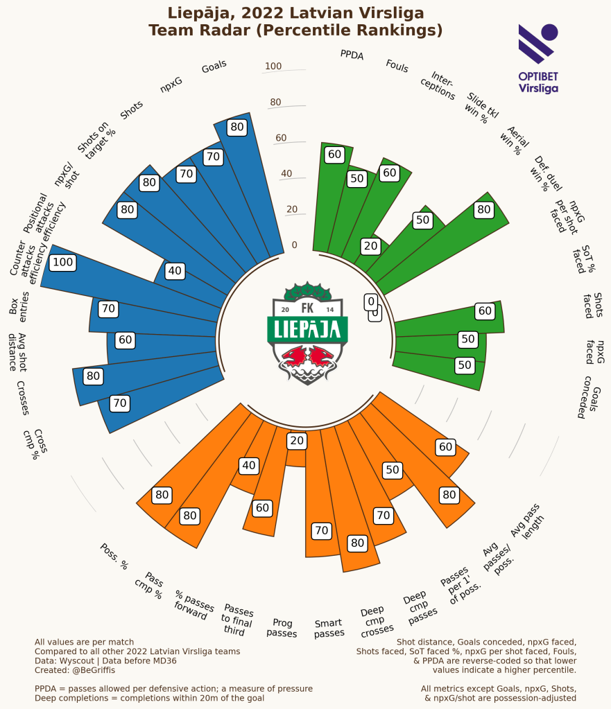 Red flags arise for Liepāja when we look at their defensive metric rankings. Especially that they allow their opponents to take the best shots on average. 0th percentile for npxG per shot faced is incredibly worrying when coming up against the team who themselves take the best shots on average. This single paired-metric alone should give us some decent insight into who should win this match.