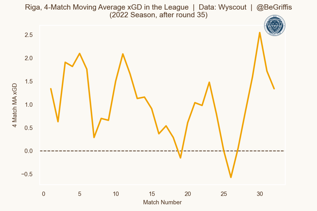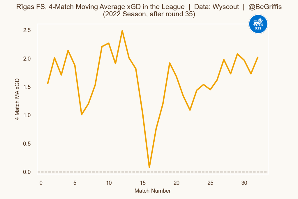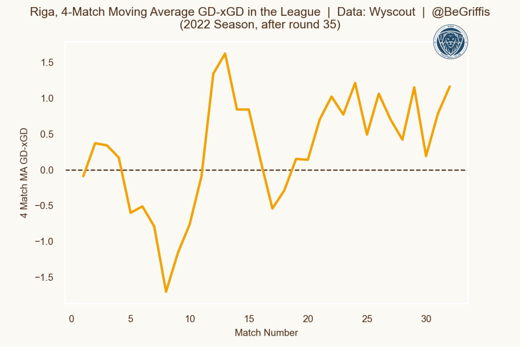 However, RFS’s moving average xGD has been remarkably stable for most of this season, and stayed at very high levels, about +1.75. We might just expect this to continue given their low variance (up/down movement in the line) in recent matches, especially compared to Riga FC. However, coupled with their typical under-performance of their xGD, this might not be enough.