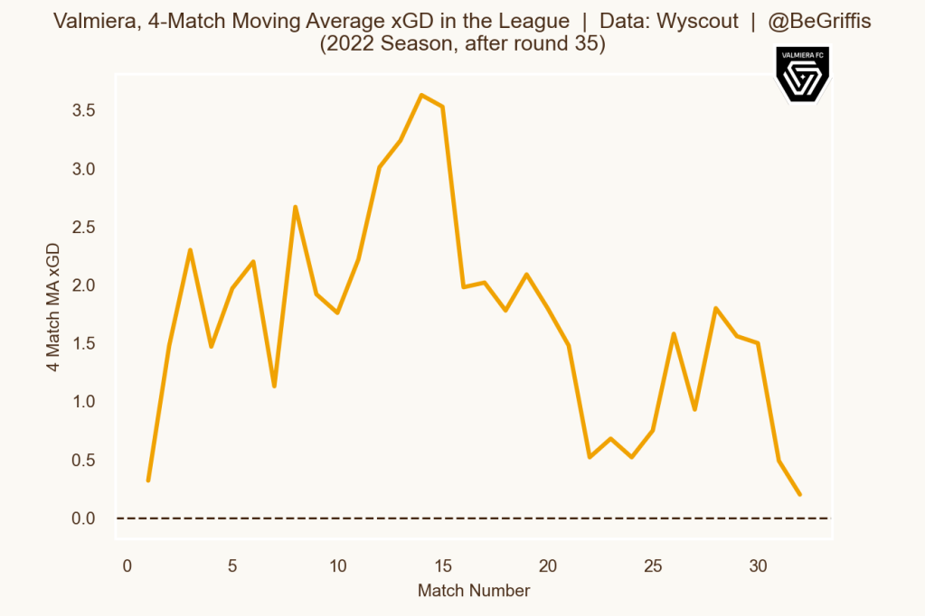 Next let’s look at an indicator of form, just the expected goal difference (xGD). Valmiera’s 4-match moving average xGD has been above zero the entire season; a mark of an incredible team. However, they have been trending dangerously to zero in recent matches, and are at their lowest moving average xGD of the entire season, something they’ll hope to reverse in the final match.