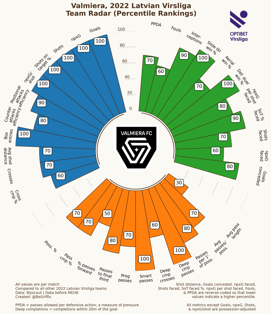 The first thing we notice with Valmiera’s radar is the walls of color! They record the best numbers in the league for many of the critical attacking metrics, like goals, npxG, and shots taken. A dangerous piece of info Liepāja can take from this is that Valmiera take the most shots per game, and also the best shots on average (as Valmiera’s npxG per shot is the highest). Valmiera Also cross fairly often, and are adept at completing those crosses. Overall, they are almost certainly the most dangerous attacking side in the league this season.