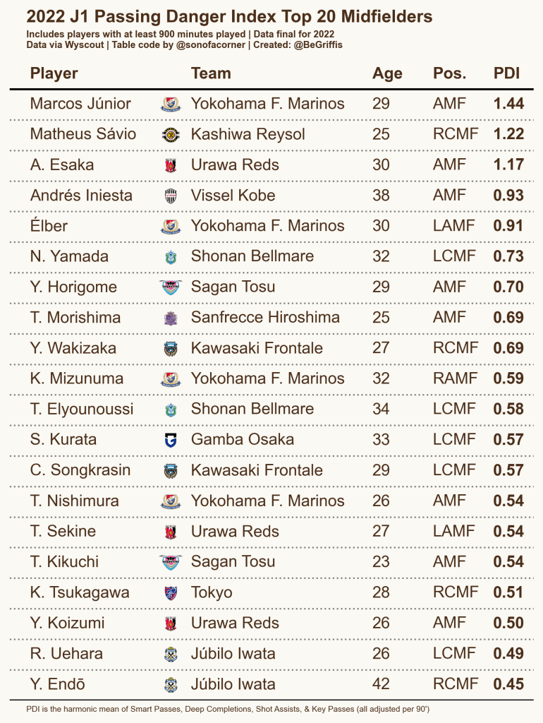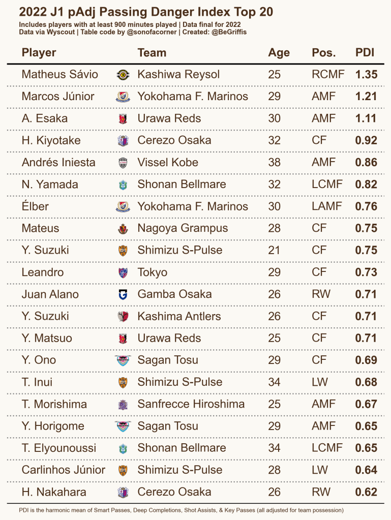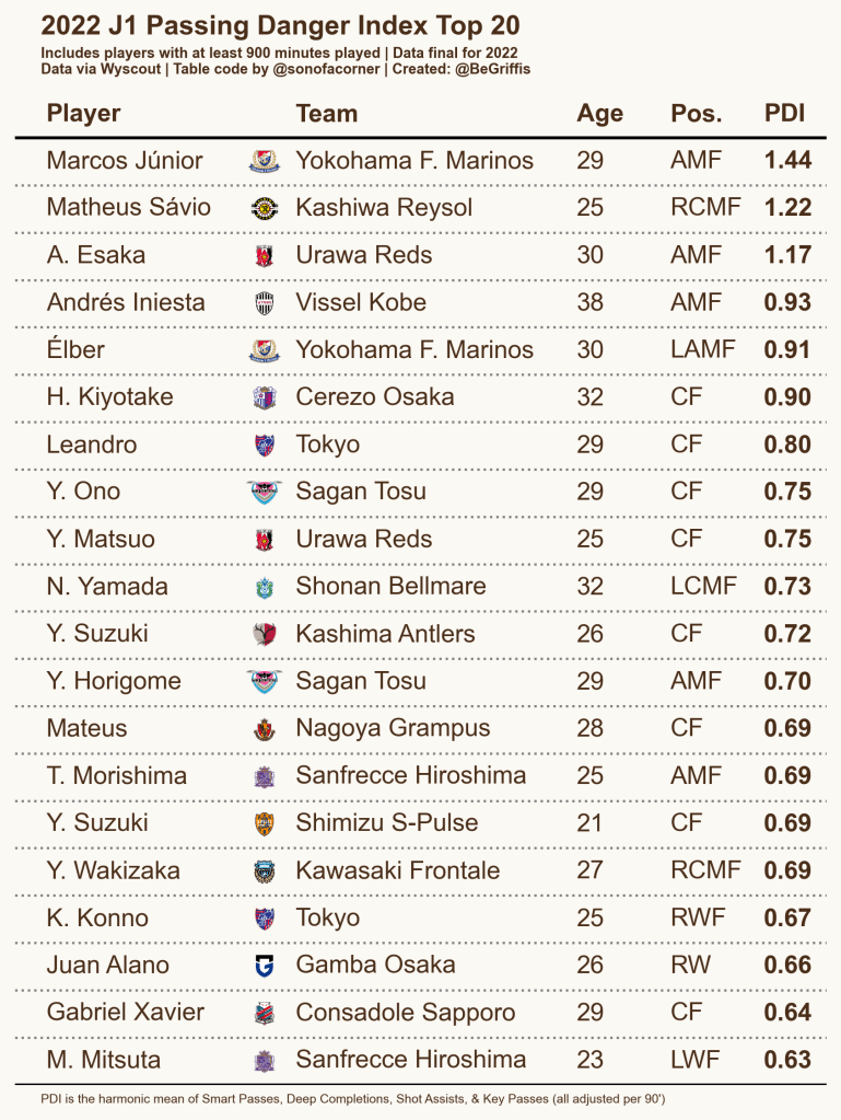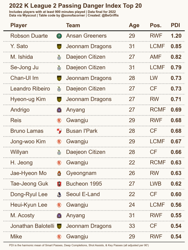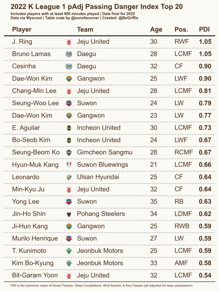 Jeju United make up the top 2, with winger Jonathan Ring and midfielder Lee Chang-min having the largest PDIs, although Lee and Bruno Lamas tie on two decimals, my program doesn’t round so Lee would have an ever-so-slightly-higher number than Lamas.