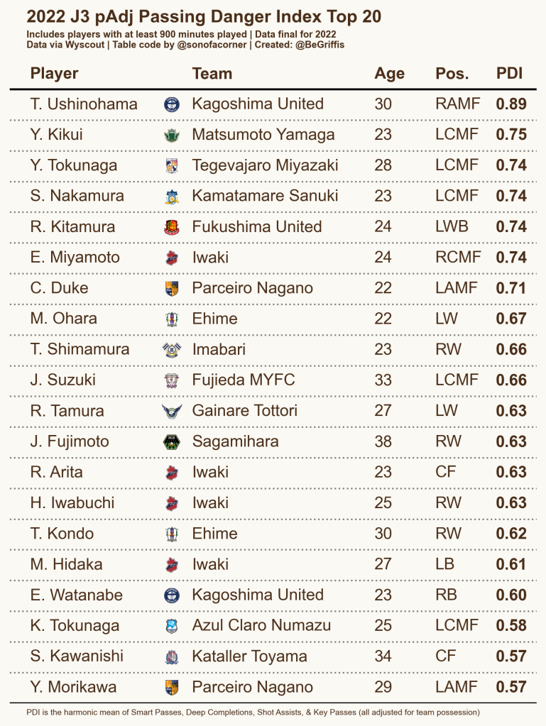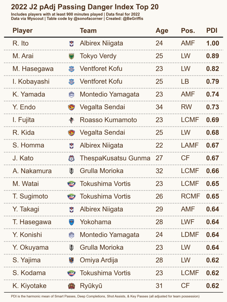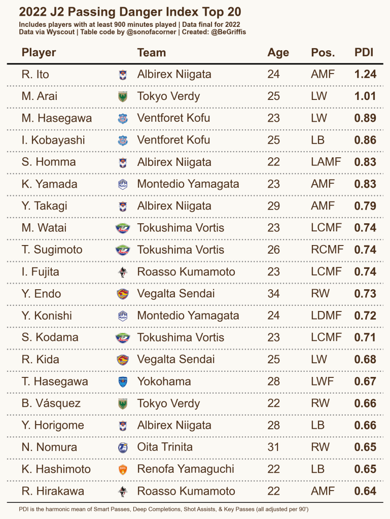 Now that I’ve rambled on the idea, method, and possible use, let’s see some examples. I’ll give PDI data on two of my favorite countries, Japan and South Korea. Both countries’ professional leagues recently finished, so we can look back at the 2022 season for the top 3 divisions in Japan and top 2 divisions in South Korea.