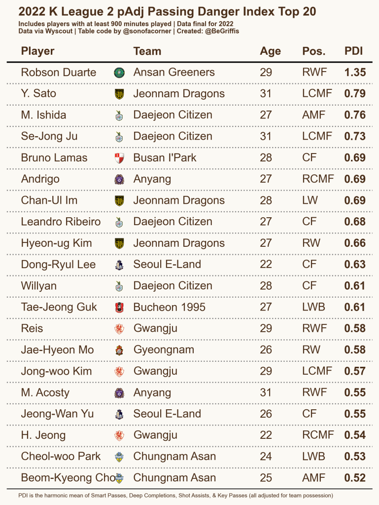 Ansan’s Robson Duarte ranks on top for K League 2, and his PDI is also quite a bit higher than Sato in second, almost 50% larger. Given that he’s also the only Ansan player in the top 20… we can see where a lot of their most dangerous passes might have come from.