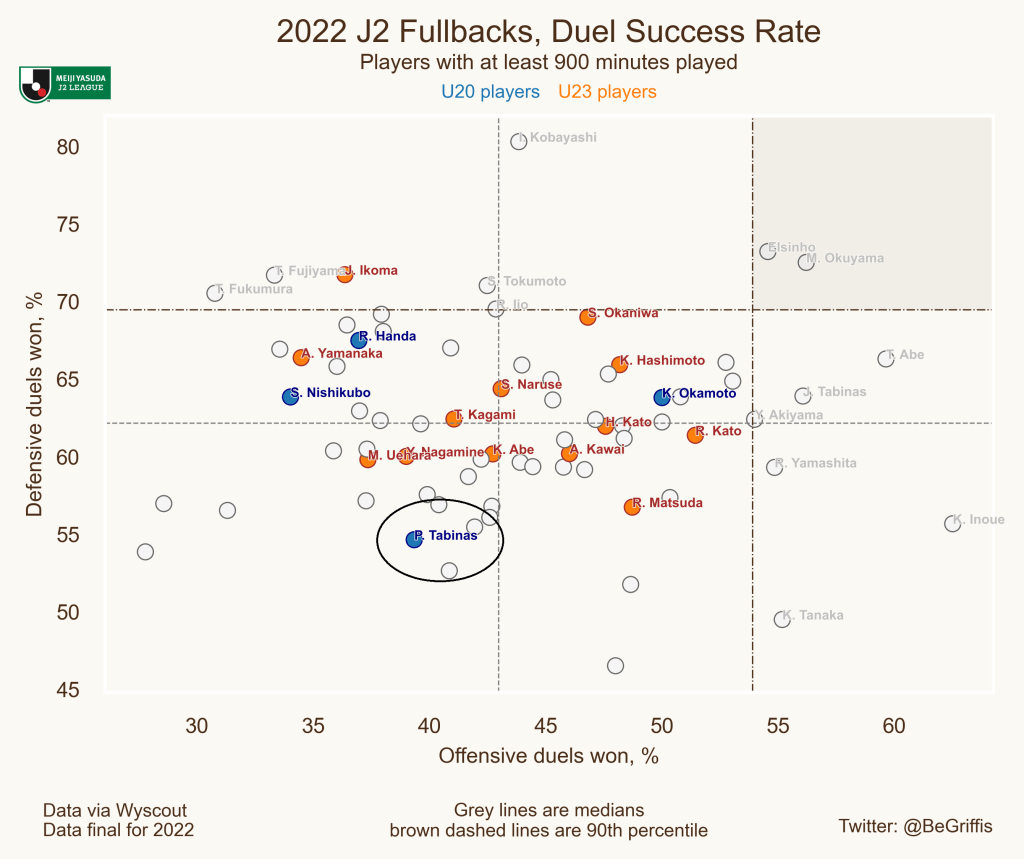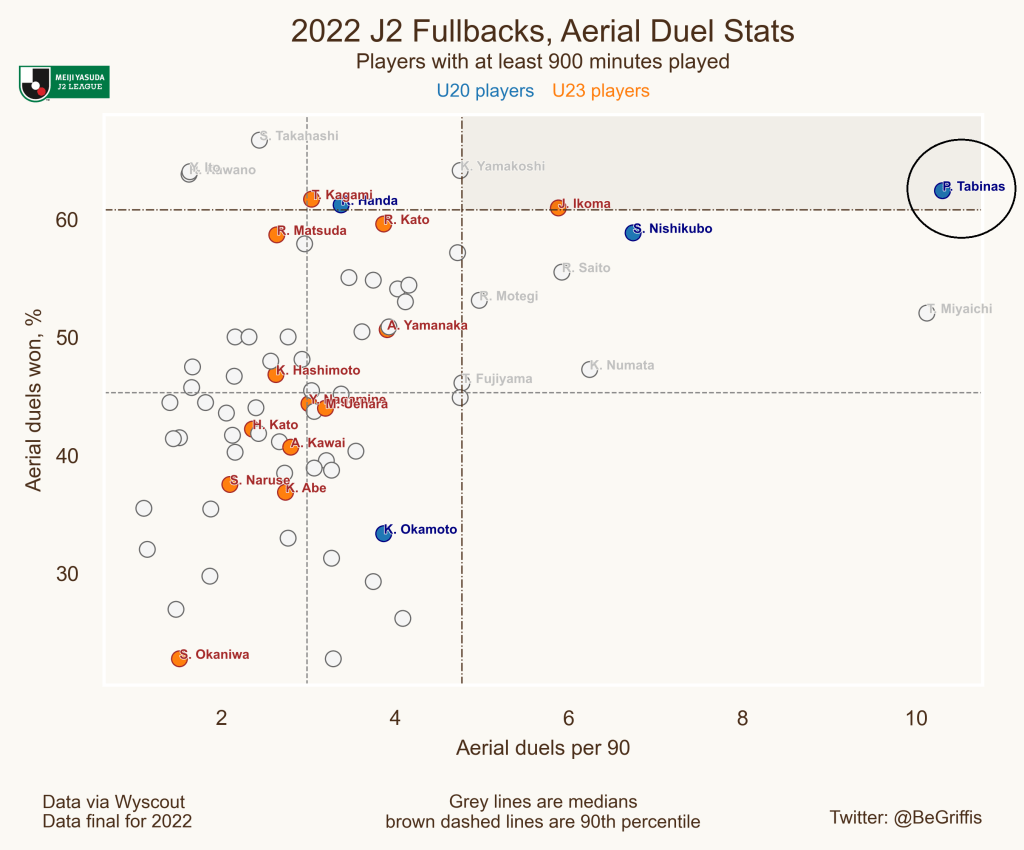 Incredible. Bismarck, as I mentioned earlier is not only a relatively tall player in the league, but can also jump very high. Naturally, he comes out as possibly the best 2022 J2 fullback in the air. He’s one of 3 players in the top 10% for both contesting aerials and success rate. Of course, I have to caveat this with saying there is some correlation between having more aerial duels per 90 and having a higher success rate, but still he’s one of just 3 players in the top 10% for both.