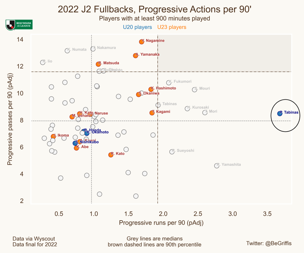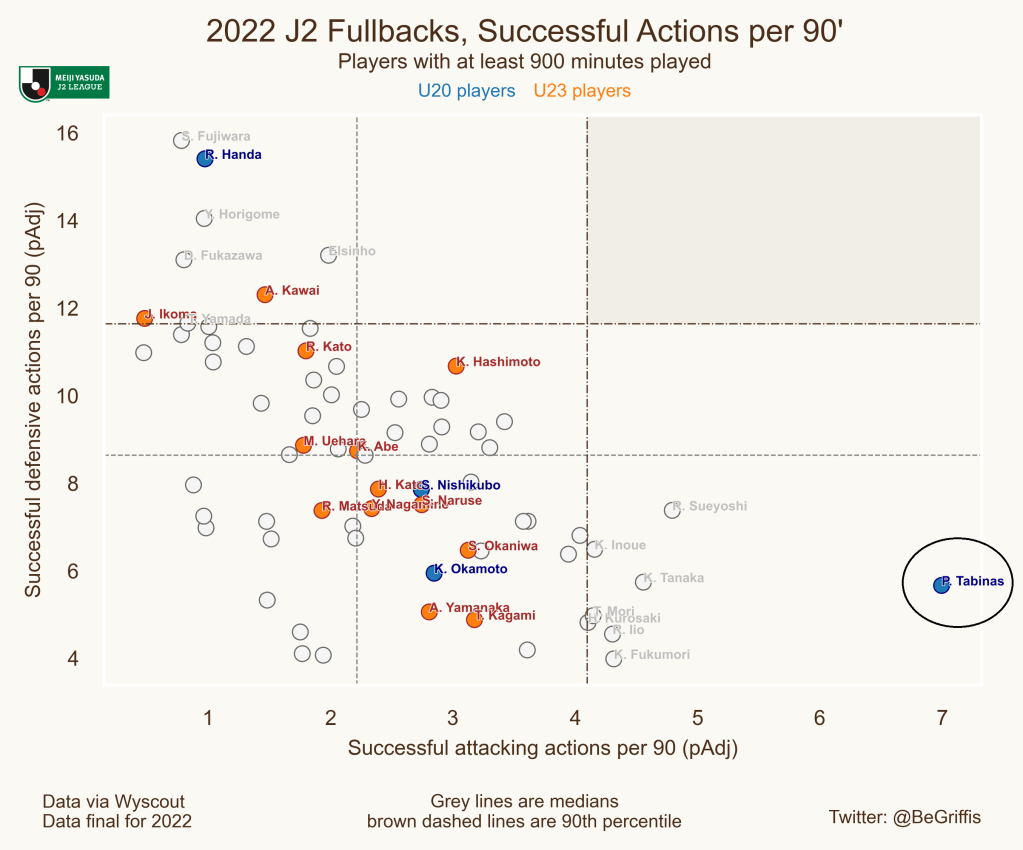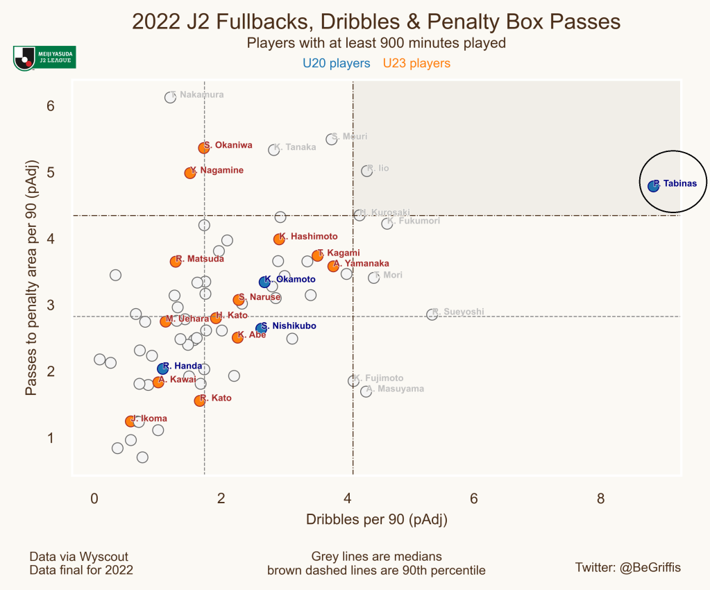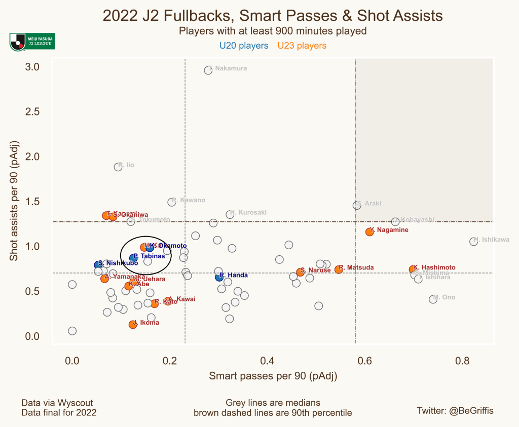 So, let’s dive in. All these graphs below show J2 fullbacks with at least 900 minutes (Bismarck barely made that, mind you), and the U23 players are all labeled, with Bismarck circled. The grey bashed lines represent the 50th percentile, and the brown dashed-dotted lines represent the 90th percentile, to the top 10% of players o the graphs.
