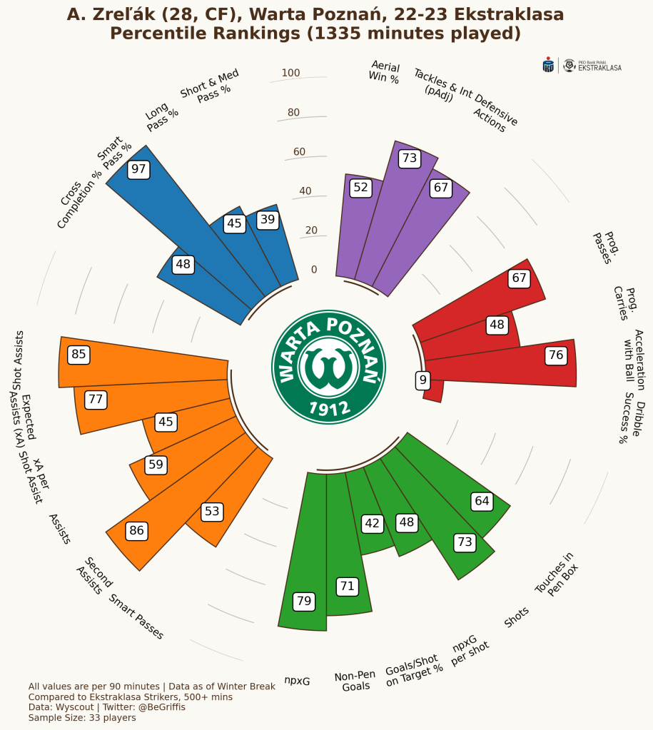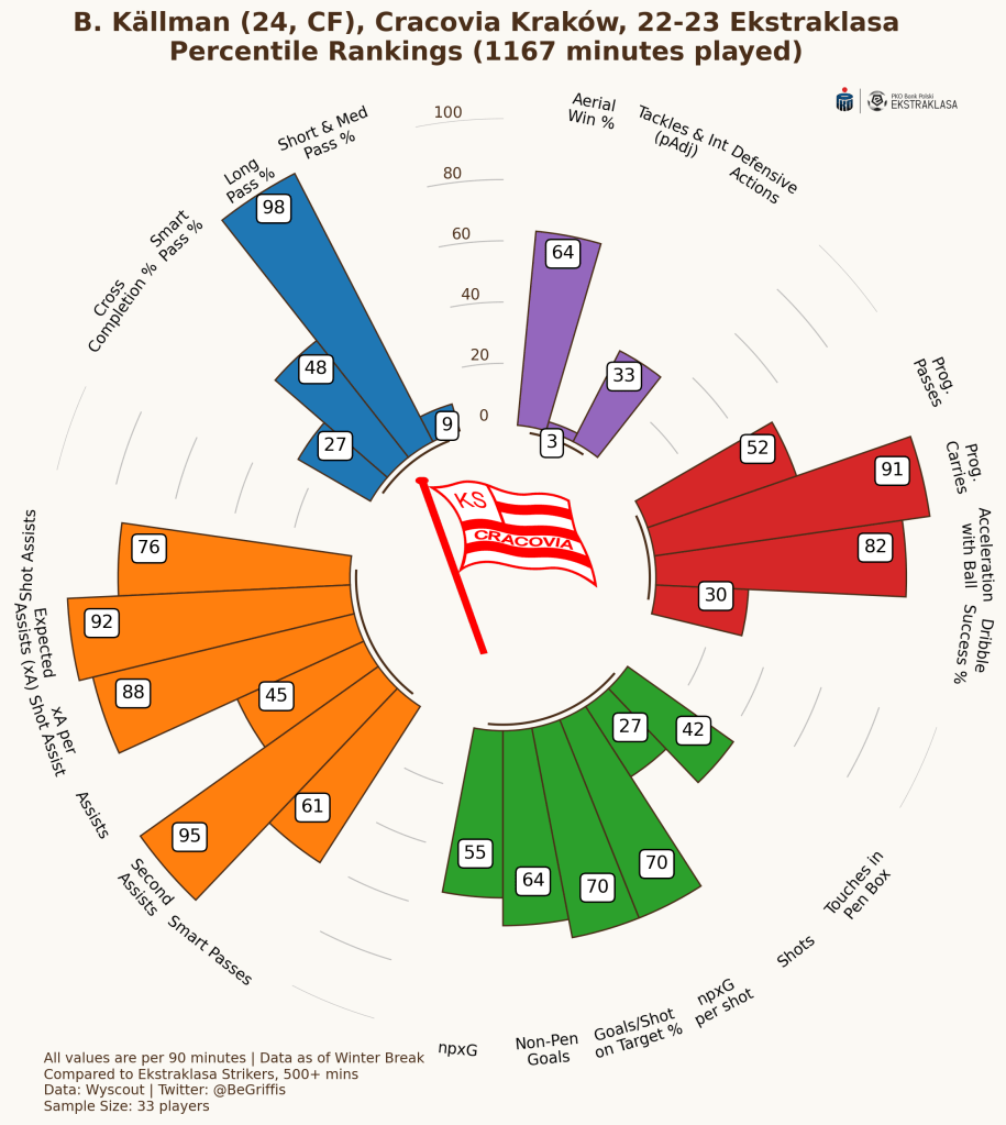 The Ekstraklasa’s mid/upper-table is very competitive this season, with 4 points separating 9th and 3rd at the halfway mark of the season. The two teams tied on 25 points, 8th-place Cracovia & 9th-place Warta Poznań might be realistic options and a good fit. Both teams have about 45% possession, play in 3-4-3 shapes that could use a striker dropping into the midfield to help release pressure and support the two midfielders at times, and both have decent strikers but rank relatively low for number of goals scored (Benjamin Källman at Cracovia, 4 goals, and Adam Zreľák at Warta Poznań). Krollis could be a good addition tactically for both teams, not as an upgrade on Källman or Zreľák, but as a rotation option for the rest of the season. If he puts in good performances he could earn a starting spot for 23/24. Please see the appendix for some graphs and more info.