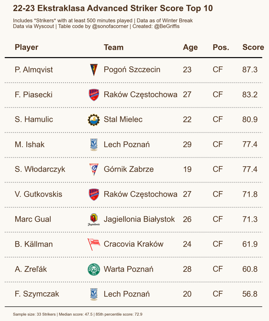 These tables below show us the top 10 deep-lying and advanced strikers in the Ekstraklasa this season. Zreľák and Källman both make the top 10, showing us two things. First, that Krollis would be a good fit for these teams, as his performances and ability line up with how the teams play right now. Second, it shows us that Krollis probably wouldn’t be able to start right away, since I’m unsure if he could move to the Ekstraklasa today and immediately be a top 10 striker in his role. I would love to be wrong about that though.