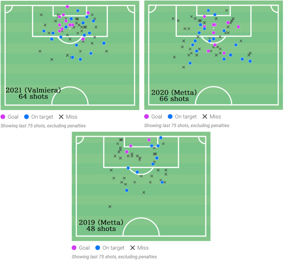 When we look at all of Krollis’ shots from the prior three Virsliga seasons, though, we do see development. While he’s not terribly effective from the sides of inside the box, he has gotten much better at shooting and scoring overall as well as narrowed his shots to be more central. We can see his shots getting much more concentrated right in front of the goal over the years.