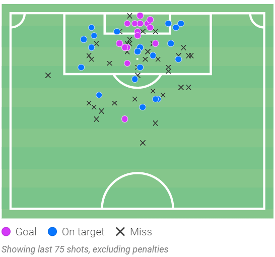 While he will take shots from anywhere in the box, all of his goals are central (using the 6-yard box as our “central” limit). And as we see from these last 75 shots, he has 20 shots on target from central positions in the box, and 14 goals. A further 17 shots in this area were off target. His on-target ratio for central shots in the box recently is 54%, and his conversion rate for those shots on target is a staggering 70%! Krollis is exceptionally dangerous when he gets into the center of the box, and when his shot tests the keeper he tends to score.
