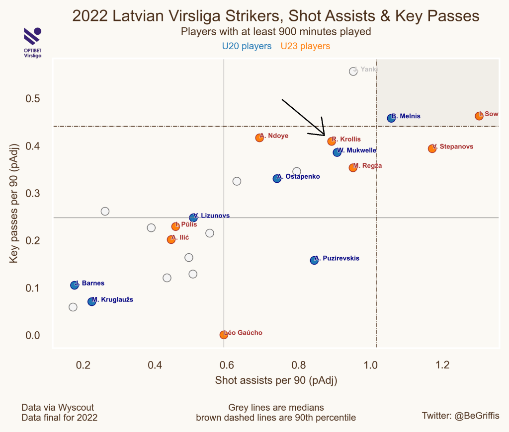 We see it’s very similar to 2022, but with some changes. Overall, Krollis improved his numbers vs other Virsliga strikers in all areas except the creation metrics. Instead of being the best striker in the league for creation, Krollis essentially became the second-best, behind Andrej Ilić in the xA (expected assists) department, but was certainly the most balanced striker in terms of creation in 2022.