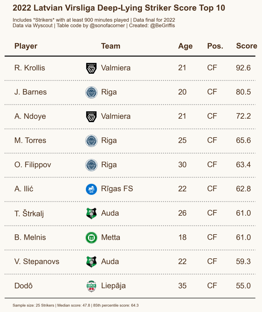 While I personally love watching the Virsliga, it’s important to stay realistic. This is a league currently ranked 35th of 55 top-flight UEFA leagues. And it’s the youngest top-flight UEFA league and each season only seems to get younger. Even though this push towards young players hasn’t decreased the quality of the league, the fact remains that Krollis has put up all of these numbers in not only the 35th best UEFA league, but the youngest too.