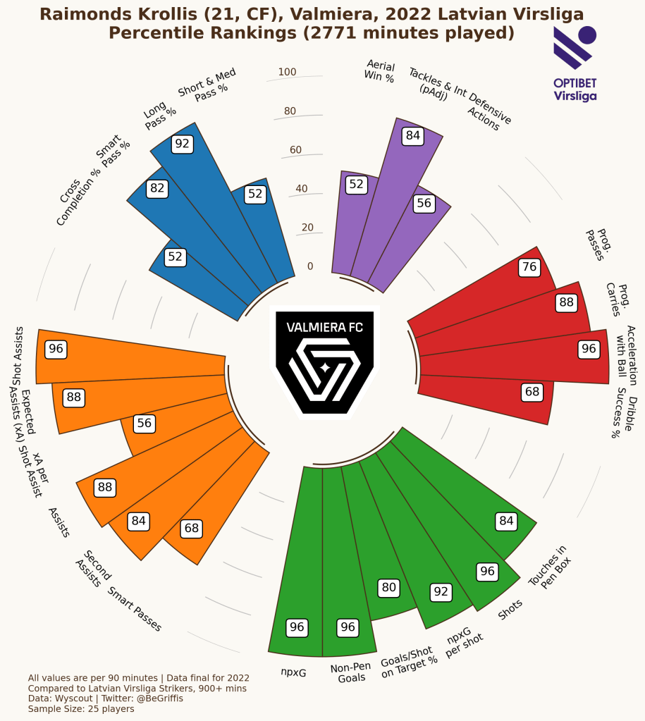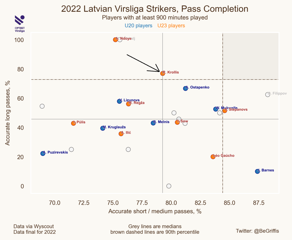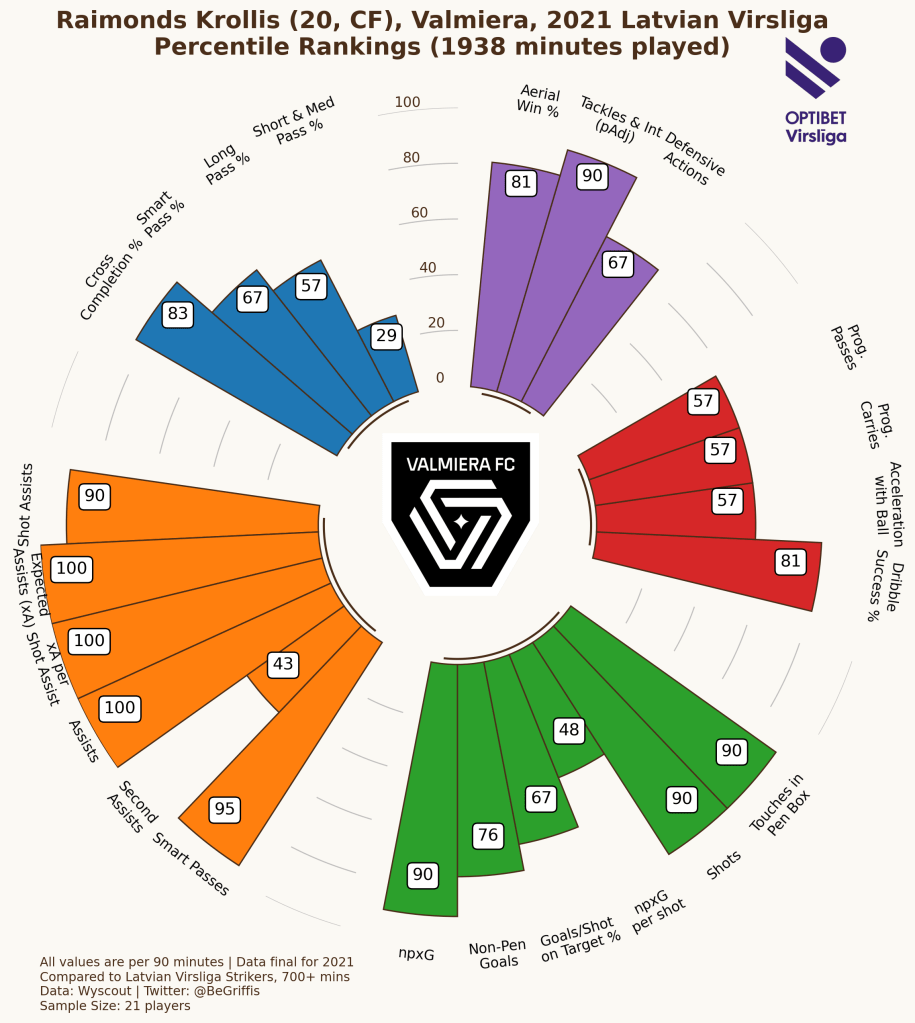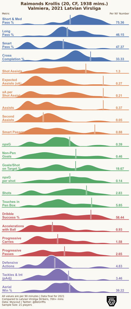 Overall, Krollis’ radar(s) give us a good view into not only his performances, but also his style as a player. In the Virsliga, he’s a great finisher, able to score with both feet (although much prefers his stronger left) and his head. He’s maybe not the best aerial finisher as he can often be beat in tight aerial contests, but his movement allows him to get open in the box where he can tap it home instead of having to contest in the air. The service I think he prefers is to his feet, not in the air.