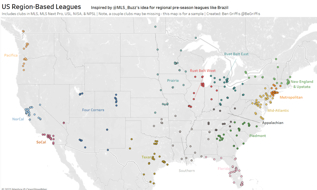 MLS Buzz had an idea that I decided to run with… What if the US, with a closed top division, formed a state/regional league system, including all clubs from the MLS, USL, NPSL, and NISA?