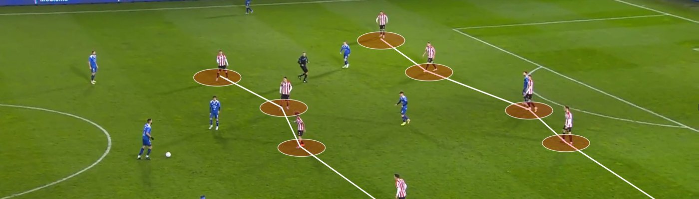 There’s no right or wrong in this analysis. It’s simply two different ways of describing the events that took place in the game. As I’m trying to develop my defensive lens, I’m of course going to watch all matches with a defensive viewpoint. I’ve stopped focusing as much into how teams are building up in possession and why, and more into how the team out of possession is shaping up to passively or actively defend that build up, and why. It’s a weird shift, to be honest, because so much analysis out there that I’ve learned from is focused on the whats & whys in possession, with relatively less on the whats & whys out of possession. Pressing is probably the only out of possession topic that comes to mind as having lots of detailed and varied analysis on, likely because many top teams in the 2010s were a pressing machine.