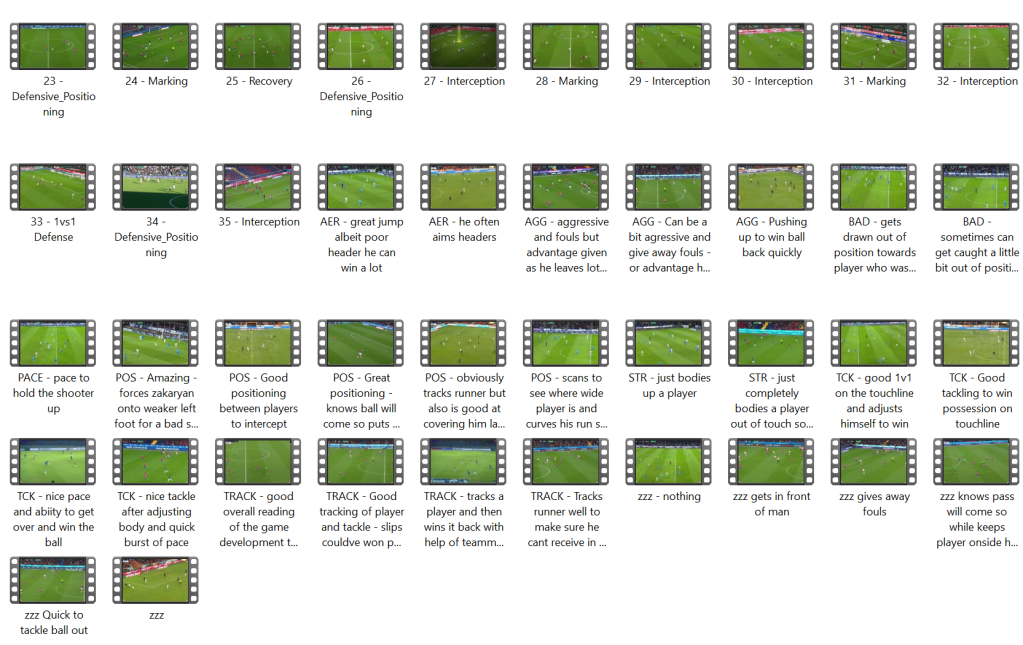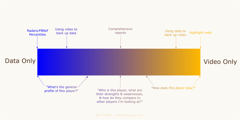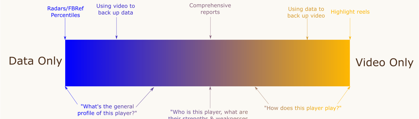 The spectrum of data vs video might be (very) roughly conceptualized like this above. Using just data would be good for seeing a quick profile of a player’s numbers and how they compare to others in their position and league. But without video, you are only getting a basic profile and lose out on much needed context. For example, do they have a low pass completion rate because they are bad at passing, or because they play a role in their team that requires them to play more passes which are typically high-risk-high-reward but low completion rates? Going further, how does that player’s pass success rate compare to other players in a similar team and role?