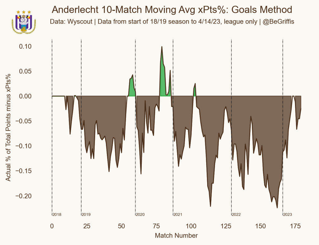 With that said, the xPts% and xPts can be a valuable tool for seeing if a team’s current points are about what they should have, or if they’re likely over- or under-performing. Like with goals vs xG, a team over-performing over a short period of time will probably have some correction later on. Below I have a very rough sketch of this, looking at Anderlecht’s 10-match moving average Actual xPts% vs xPts% via Goal Method. It looks at each 10-game span, dividing the actual points won by 30, and then subtracting from that number the xPts% based on the goals for & against in that same 10-game span.