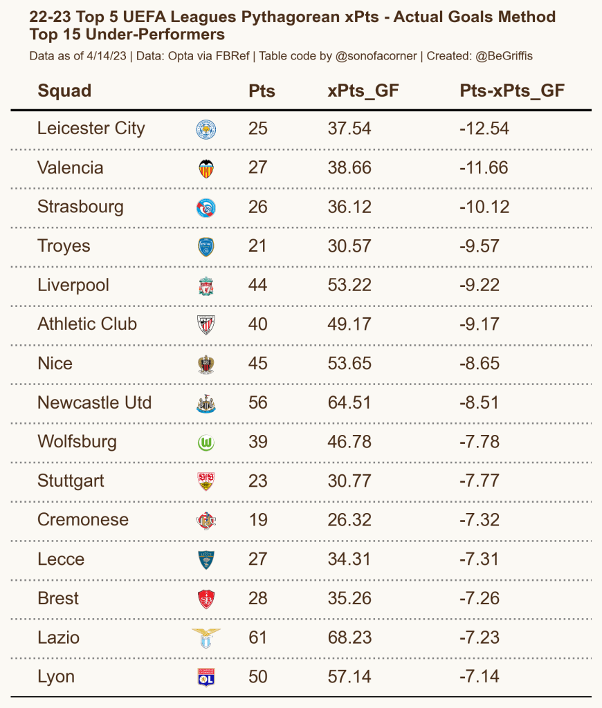 As of time of writing, Leicester are currently the biggest under-performers when using the goals method of calculating Pythagorean xPts. They have won about 12.5 fewer points than expected, based on the number of goals they have scored and allowed. Valencia and Strasbourg are the other teams who have under-performed by at least 10 points this season.