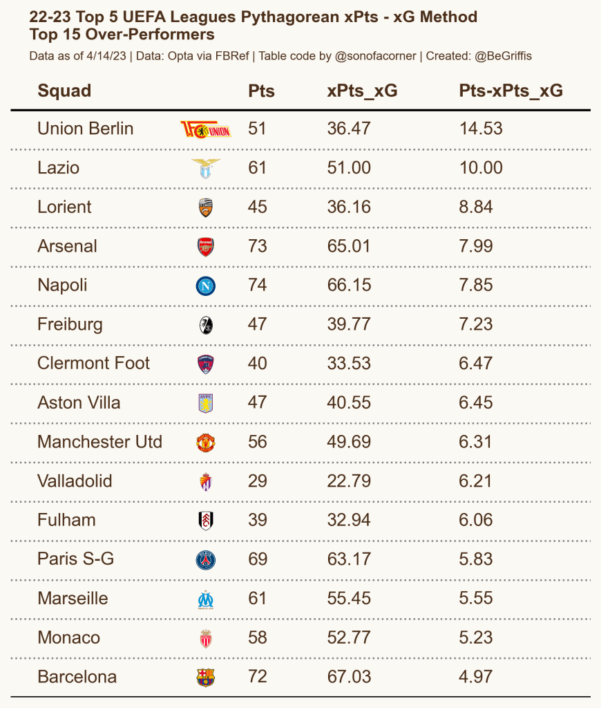 Finally we get to the biggest over-performers based on xG and xGA. Union Berlin take the cake, which makes sense given they have basically the joint-lowest xG in the Bundesliga this season and also the 3rd-lowest xGA. They’ve scored about 13 more goals than their xG, which naturally will give them wins or draws that they shouldn’t be “expected” to get.
