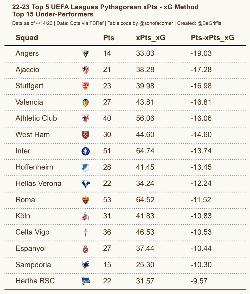 Now we shift to the xG method of xPts. Remember that this has a lower correlation with Actual Points than the Goals method. Regardless, Angers are the biggest under-performers in the Top 5 UEFA leagues so far given their xG and xGA. Expected to earn 33 points, they’ve only earned 14, less than half of their expected total. Ajaccio are right behind them, which makes sense since both clubs have almost the exact same xG (33.7/33.8 respectively), but Angers have about 7 more xGA (48.2/41.0 respectively).