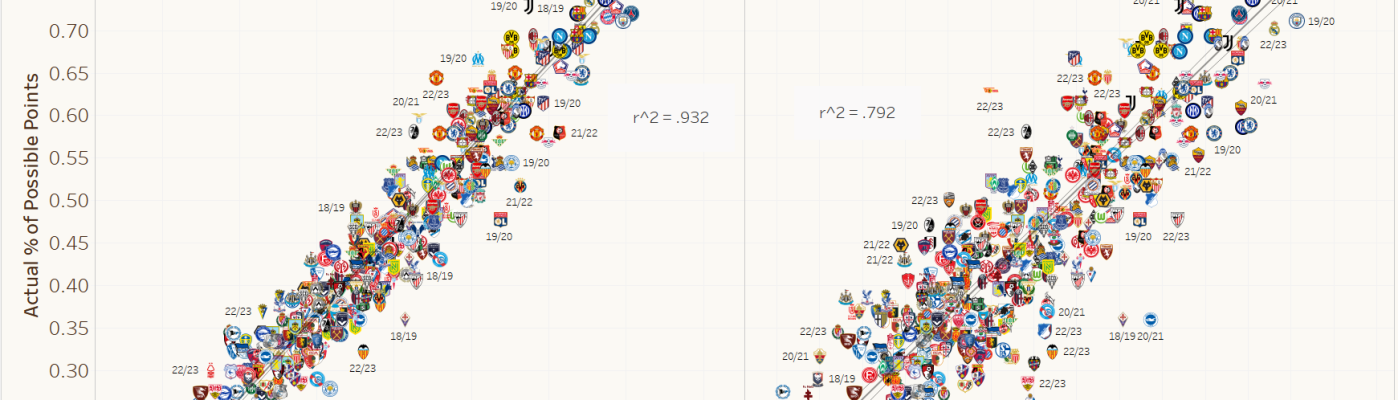 However, I will introduce two methods of calculating xPts% in this article. Because football is such a low-scoring game and goals can often be random, I’ll create the same model but use expected goals for (xG) and against (xGA). Don’t worry, I’ll share all the same data for both models and offer my thoughts at the end. But, given that runs scored/allowed and points scored/allowed usually provide enough info about a baseball or basketball team’s true performance, respectively, and many times goals for/against doesn’t in football, it’s worth having a look at the xG xPts%. That’s why xG was invented in the first place, to get a much better feel for a team’s true performances since goals can often be much more random in football than baseball or basketball.