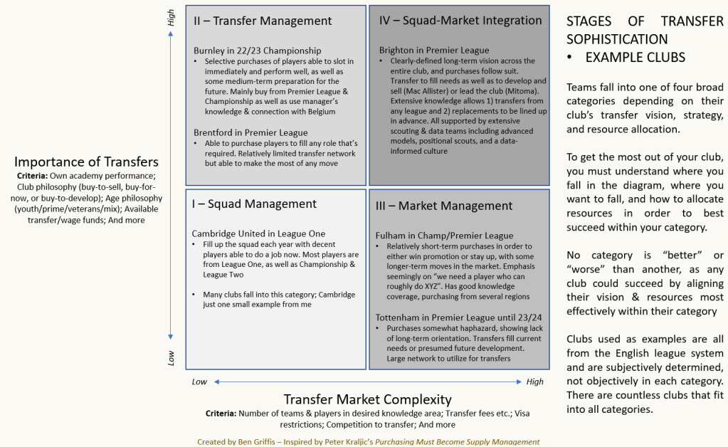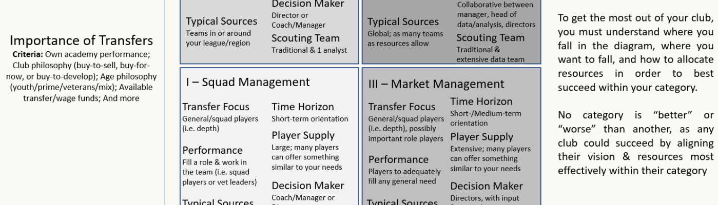 These factors naturally lead to four “stages”, or categories, of transfer sophistication, to use Kraljic’s term. I have termed these – from I to IV – Squad Management, Transfer Management, Market Management, and Squad-Market Integration. Each stage has different focuses, decision makers, time horizons, and more, leading to unique setups that a club’s transfer strategy can exhibit. I would suggest we think about these as stages that a club voluntarily puts themselves into, rather than being grouped into a stage via external factors. Even if some aspects like work permit/visa restrictions are environmental factors, much of what determines a club’s position on this matrix is created by the club.